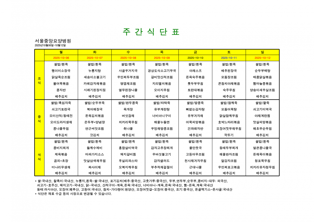 서울 중앙요양병원 10월 둘째주식단표