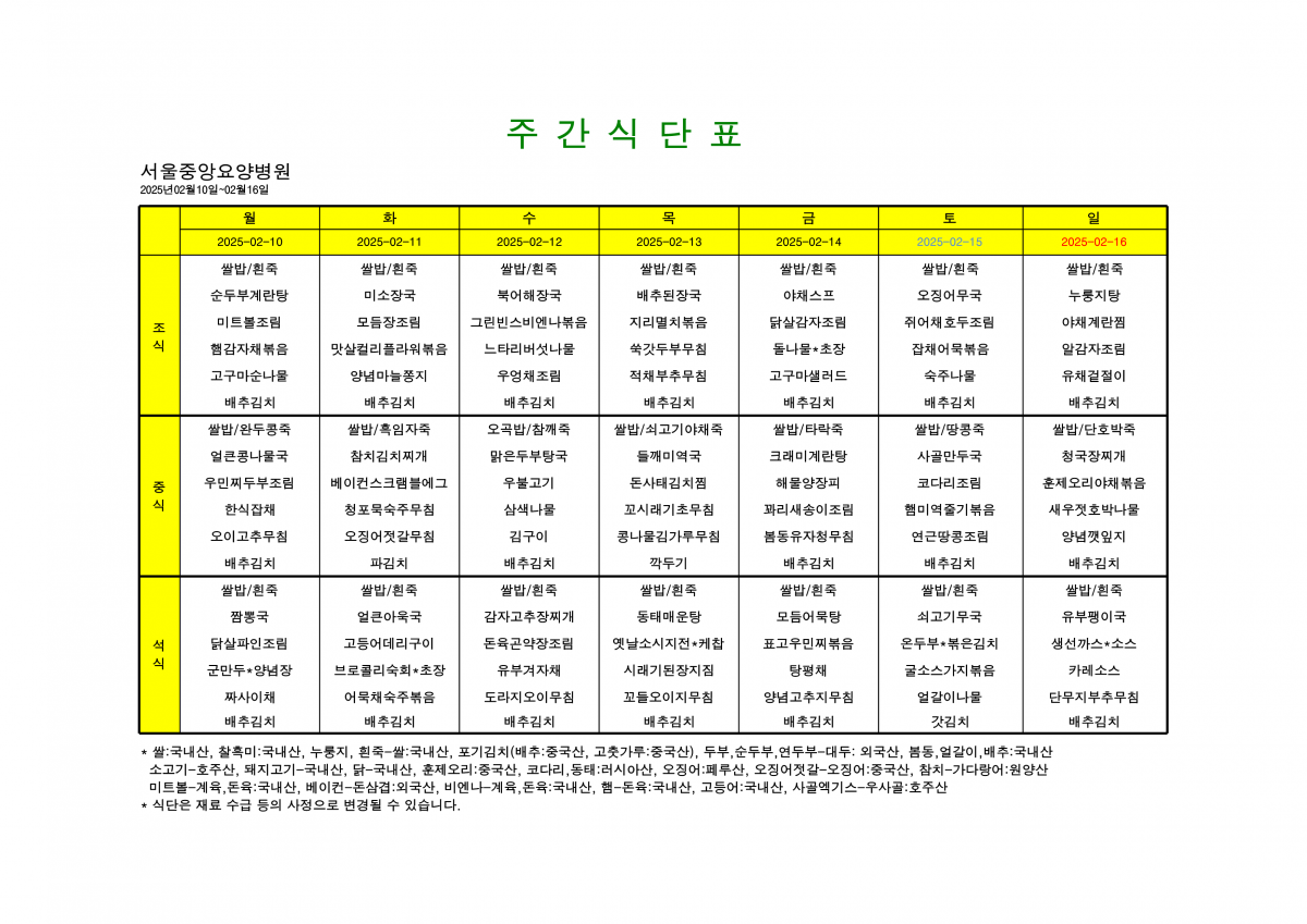 서울 중앙요양병원 2월 둘째주식단표 > 식단안내