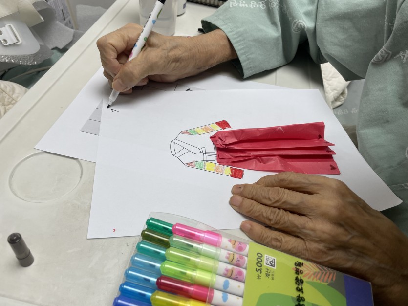설날을 맞이하여 한지를 이용한 한복치마만들기 프로그램을 진행하였습니다. 프로그램을 진행하면서 한지를 자르고 붙이는 과정에서 다소 어려움을 느끼시는 분들이 계시기는 하셨지만,