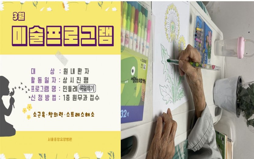 봄을 맞이하여 민들레 색칠하기 프로그램이 진행되었습니다. 단순히 도안 색칠하기만 하는 시간이 아니라, 소근육 활동을 통해 남아있는 잔존기능율 유지하고 기억회상,